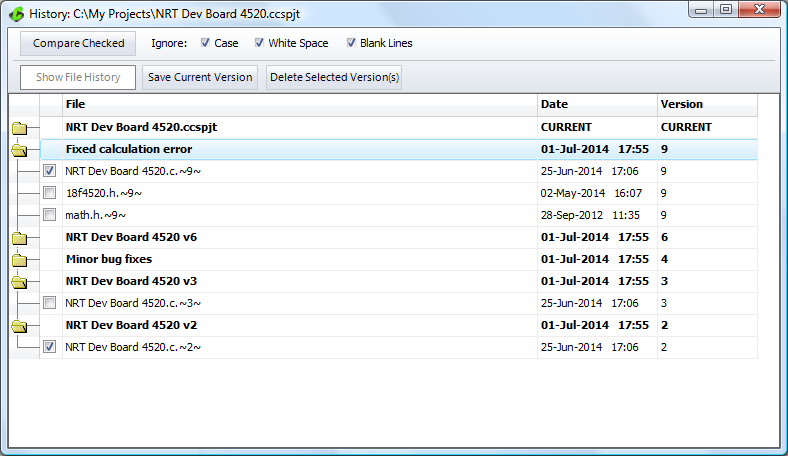 In the Project History tool, by expanding a project version, it displays all of the saved files in that version. Selecting files for comparison, or viewing individual file histories, can be accomplished from here. Clicking the 'Save Current Version' button makes a copy of all current project files and adds it to the version list. These newly copied versions cannot be overwritten by the IDE's History option. The copies can only be deleted through the Project History tool by selecting these versions and clicking the 'Delete Selected Versions' button.